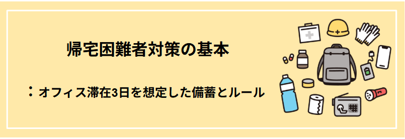 オフィスならではの防災対策と言えるのは、重要なデータやシステムをマメにバックアップすることや、BCPを策定し、災害後も速やかに事業を継続できる体制を整えておくことくらいかもしれません。安否確認の方法や連絡手段に関しては、家庭よりも人数が多くなるので、複数の方法を用意し、連絡網なども作成しておいた方がよいでしょう。