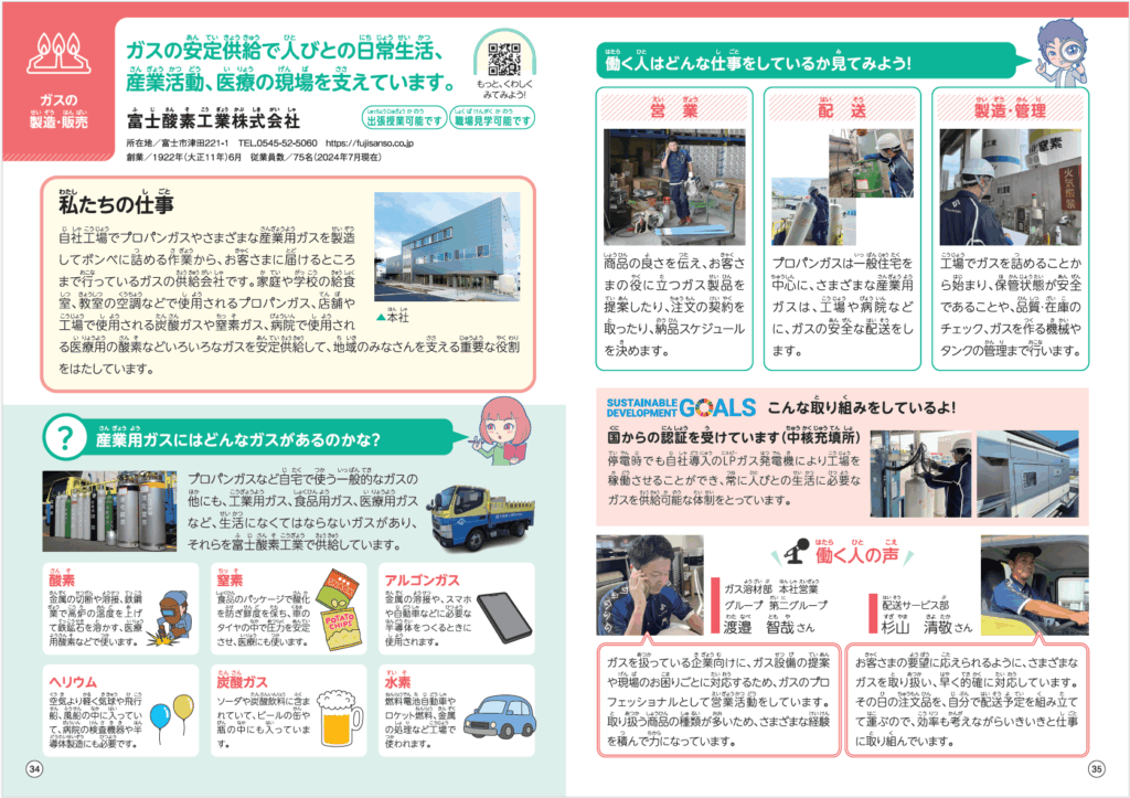 この度、文部科学省が推進する小学生のキャリア教育における副教材『小学生のためのお仕事ノート(2024年度版・中学年用/富士市)』に富士酸素工業株式会社が掲載されました。
