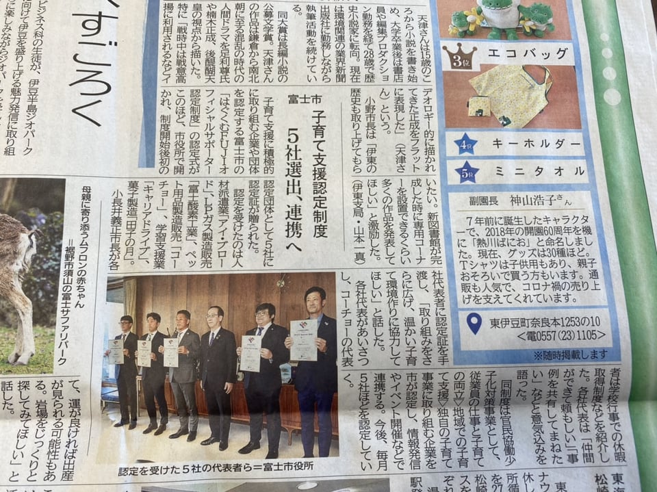 先日、富士市役所にて「はぐくむFUJIオフィシャルサポーター認定制度」の認定式が開かれ、制度開始後初の認定企業として、富士酸素工業を含む5社が認定証をいただきました。その様子が静岡新聞に取り上げられましたので、そちらも掲載いたします。