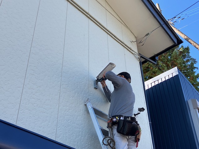 工場の外壁に設置していた常夜灯が経年劣化で点灯しなくなり、以前より明るい照明を付けてほしいとお客様よりお話をいただきました。
